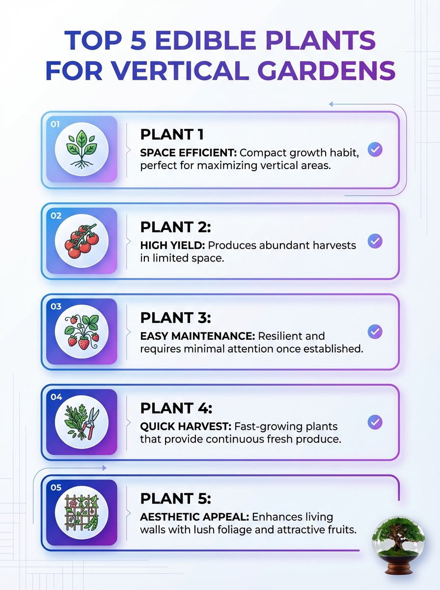 Top 5 edible plants for vertical gardens, showcased for space-saving growing. Learn which herbs and vegetables yield best in small spaces.