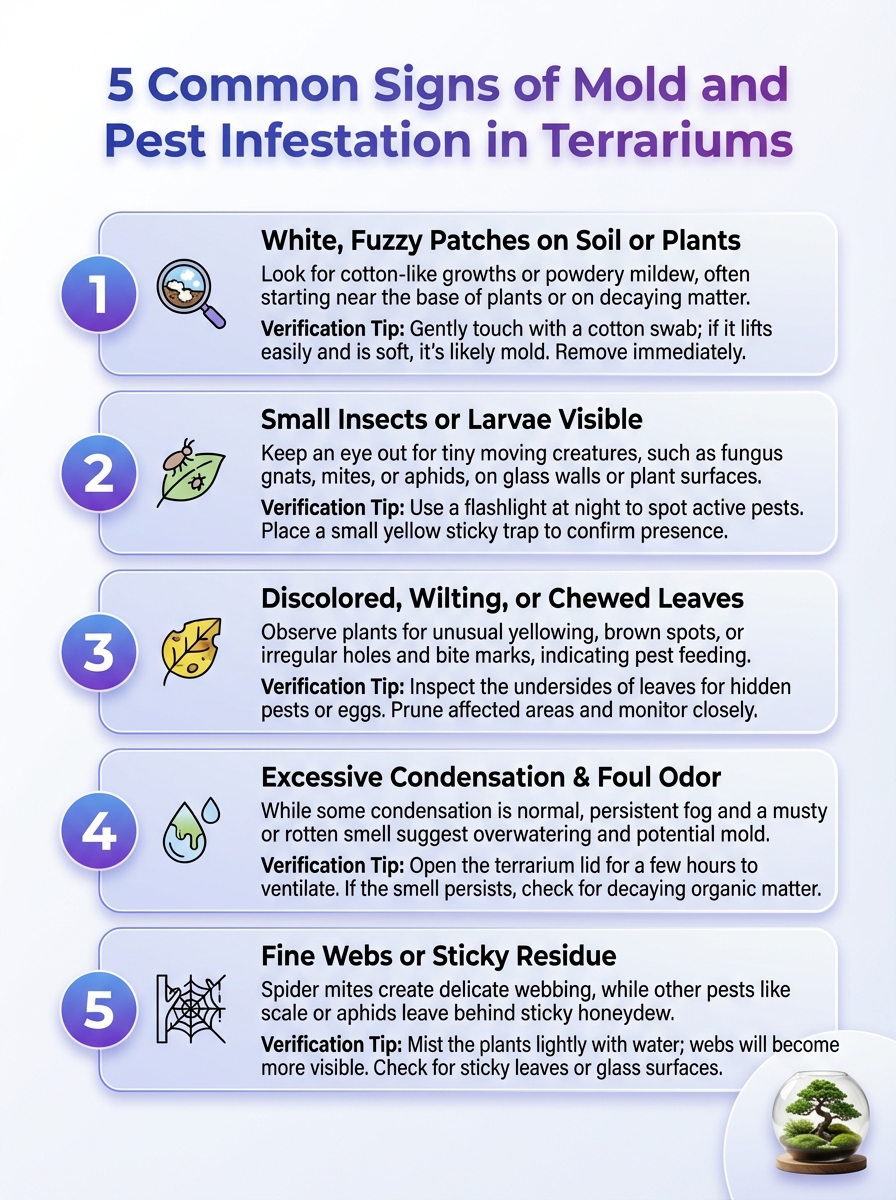 A quick visual guide to identifying mold and pest problems in terrariums. Spot the five most common signs before they spread.