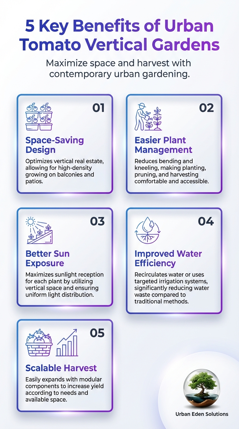 A compact guide showing how growing tomatoes vertically in urban spaces saves room and boosts yield.